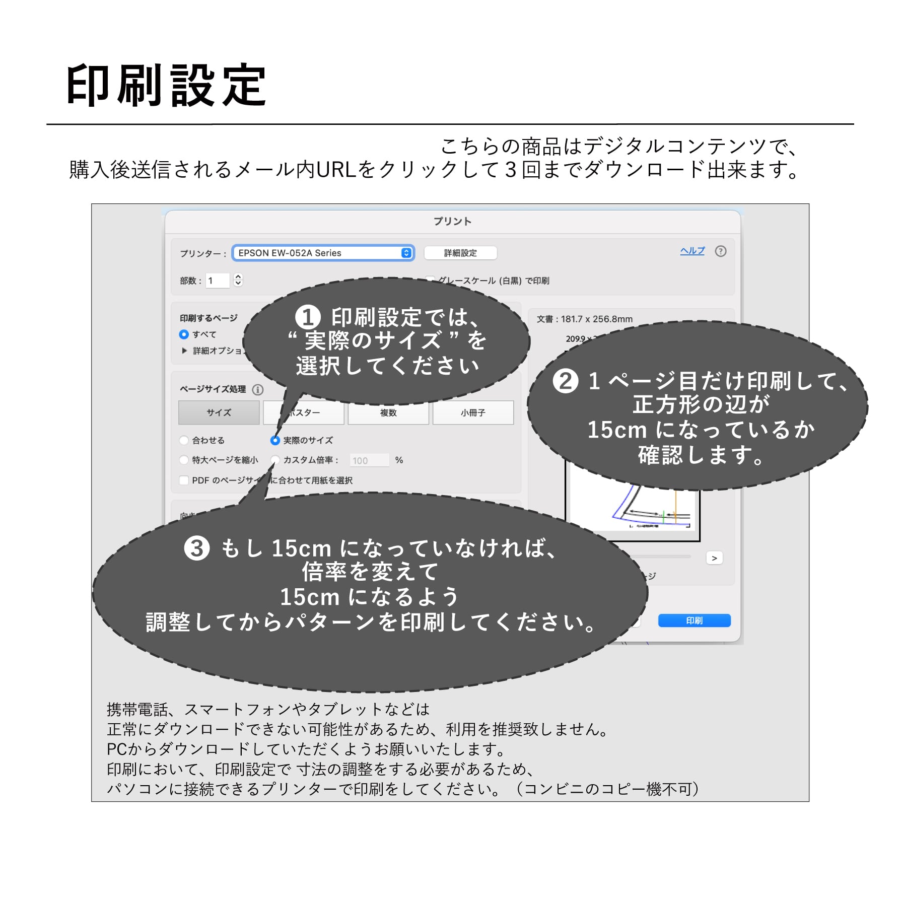 印刷において、印刷設定で 寸法の調整をする必要があるため、パソコンに接続できるプリンターで印刷をしてください。(コンビニのコピー機不可)