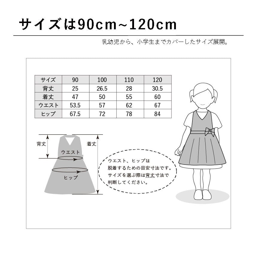 サイズを選ぶ際は背丈寸法を基準にしてください。ウエスト、ヒップ寸法は脱ぎ着可能な目安寸法です。