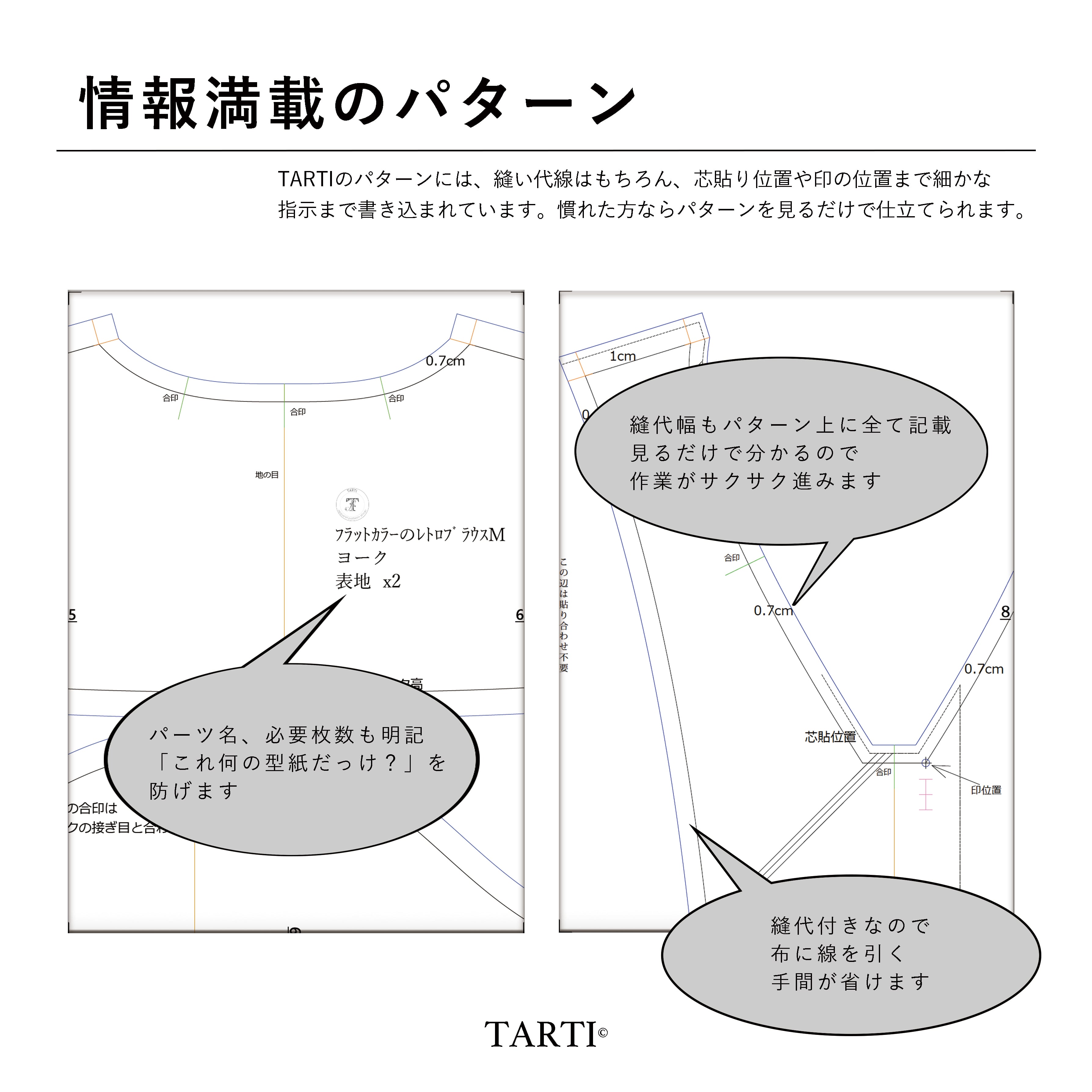 TARTIのパターンは、大人の服をハンドメイドするのに躊躇していた方にも是非作ってほしい、手作りに見えないシルエット。